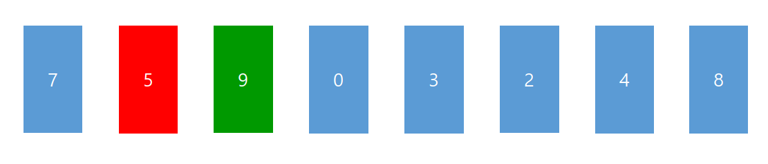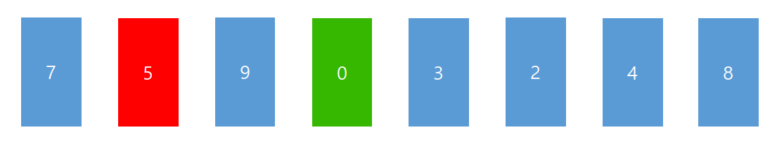이후 이와 같은 식으로 반복하다가, 마지막 원소까지 비교가 끝나면 첫 번째 원소와 최소 값을 가진 원소를 서로 바꾼다.